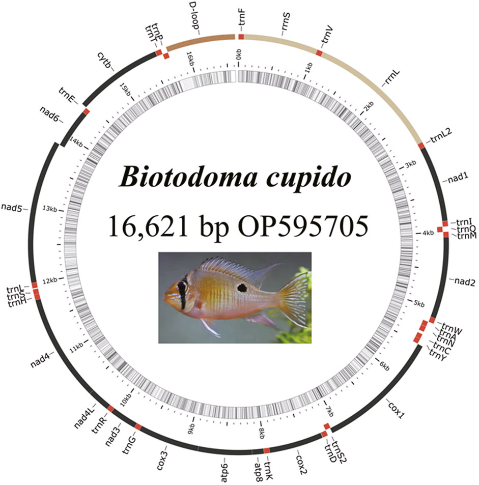 To date, only two species (B.cupido and Biotodoma wavrini) of the genus Biotodoma (Leibel, 1995) have been reported, and complete mitochondrial sequences are currently unavailable for both species. In this study, we report the complete mitogenome structure and characteristics of B. cupido. Furthermore, we conducted phylogenetic reconstruction using the newly generated B. cupido mitogenome alongside other available complete Neotropical cichlid mitochondrial genomes sourced from GenBank, to rigorously evaluate its phylogenetic position. Such a comparative analysis of whole mitogenomes provided new insights into the evolutionary relationships in New World cichlids and reaffirmed the phylogenetic position of B. cupido.