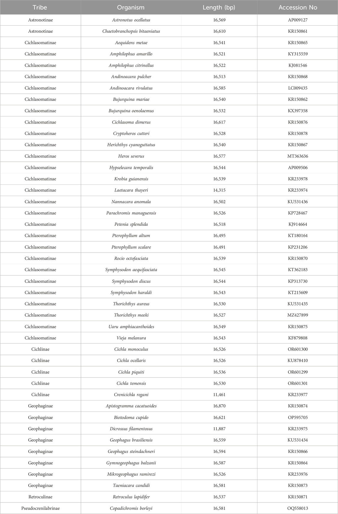 Wang, J., Tai, J., Zhang, W., He, K., Lan, H., and Liu, H. (2023). Comparison of seven complete mitochondrial genomes from lamprologus and neolamprologus (chordata, teleostei, Perciformes) and the phylogenetic implications for cichlidae. ZooKeys 1184, 115–132. doi:10.3897/zookeys.1184.107091