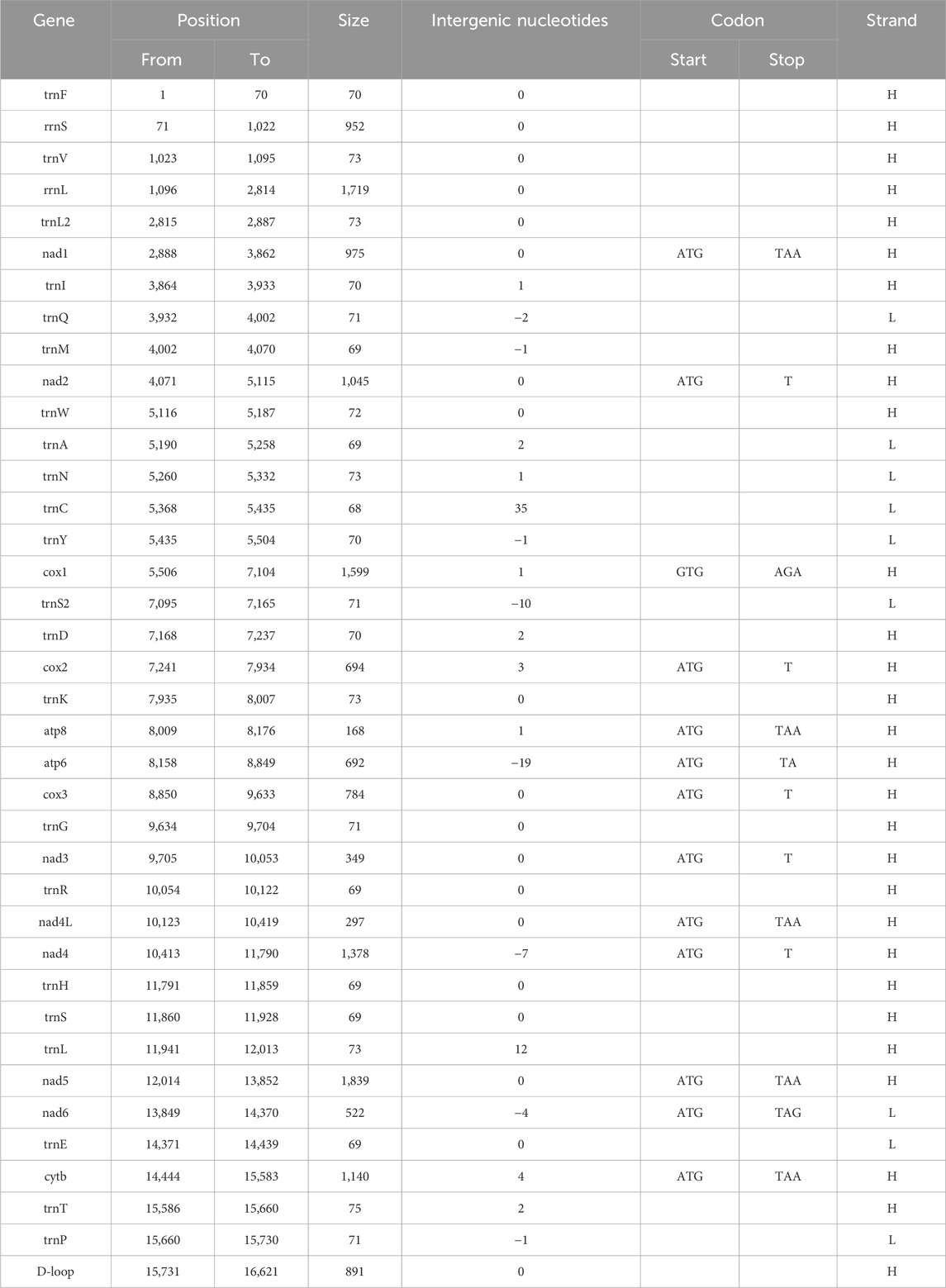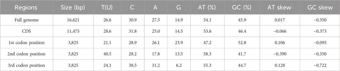 We analyzed the base composition and codon usage frequency of the annotated mitochondrial genome sequence using MEGA software (version 11) (Kumar et al., 1994). The AT-skew and GC-skew values were calculated according to the following formulas: AT-skew = (A−T)/(A + T) and GC-skew = (G−C)/(G + C) (Perna and Kocher, 1995). Finally, we generated a circular representation of the complete mitochondrial genome using the MitoFish web server (Zhu et al., 2023).