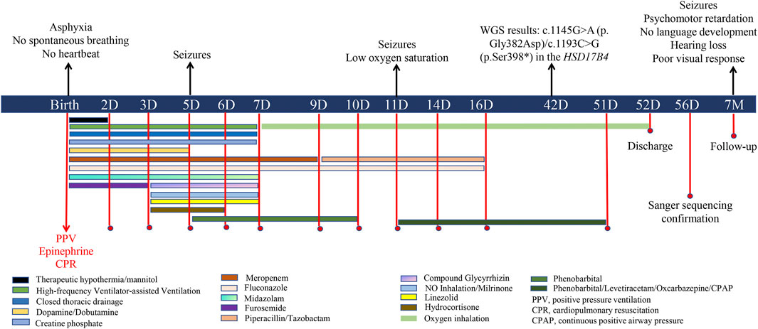 On admission, physical examination revealed a body temperature of 35.5 °C, no spontaneous breathing, no heartbeat, and a blood pressure of 40/20 mmHg. The skin appeared pale and ecchymotic, without rashes, dehydration or edema. No significant facial dysmorphism was observed. Both pupils were dilated, and the pupillary light reflex was absent. The spine and limbs were normal, but the muscle tone of the limbs was weak. The baby did not have spontaneous movement, and the rooting reflex, sucking reflex, grasping reflex, and Moro reflex were absent. Tracheal intubation was reperformed under PPV, and external chest compression was carried out for cardiopulmonary resuscitation (CPR). Vital signs were absent for 10 min, and the heart rate returned to 90 beats per minute after infusion of epinephrine, with a blood oxygen saturation of approximately 85%. Afterward, the patient was supported with tracheal intubation and high-frequency ventilator-assisted ventilation for respiratory failure. Blood gas analysis revealed pH 6.79 (normal range: 7.35–7.45), PCO2 81.32 mmHg (reference range: 35–45 mmHg), PO2 26.52 mmHg (reference range: 80–100 mmHg), HCO3 8.30 mmol/L (reference range: 21.4–27.4 mmol/L), base excess −23.39 mmol/L (reference range: −3–3 mmol/L), and lactic acid 16.91 mol/L (normal range: 0.5–1.6 mmol/L), indicating severe metabolic acidosis and high lactic acidosis. A blood routine test showed elevated white blood cells (WBCs, 38.39∗10∧9/L, reference range: 5–25∗10∧9/L) and platelets (311∗10∧9/L reference range: 100–260∗10∧9/L) with low levels of red blood cells (RBC, 3.90∗10∧9/L, reference range: 10–12∗10∧9/L) and hemoglobin (135 g/L, reference range: 140–220 g/L). Other laboratory tests showed significantly increased alanine aminotransferase (ALT, 430 U/L, reference range: 13–45 U/L), aspartate aminotransferase (AST, 1316 U/L, reference range: 25–76 U/L), serum neuron-specific enolase (NSE, 136 ng/mL, reference range: 0–16.3 ng/mL), creatine kinase (CK, 9335 U, reference range: 40–200 U), CKMB (195.80 ng/mL, reference range: 0–5 ng/mL), and interleukin 6 (IL-6, 3,430 pg/mL, reference range: 0–6 pg/mL); C-reactive protein (CRP) level was normal (3.3 mg/mL, reference range: 0–6). Cranial ultrasound showed no obvious dilation in the ventricles and cisterns. X-ray revealed pneumothorax and compression of lung tissue on the right side. As summarized in Figure 1, the patient was treated with therapeutic hypothermia for suspected hypoxic–ischemic encephalopathy (HIE) and prophylactic antibiotics (e.g., meropenem, linezolid, piperacillin, tazobactam, and fluconazole) to prevent infection and early-onset sepsis (EOS). Intermittent furosemide diuresis was applied to reduce brain cell edema, and mannitol to reduce intracranial pressure. Glycyrrhizin was given for liver protection and lowering transaminase levels. Dopamine, dobutamine, and creatine phosphate were used for cardiogenic shock, neonatal hypotension, and myocardial damage. Closed thoracic drainage on the right side was performed for pneumothorax and compression of lung tissue. NO inhalation and milrinone were applied for persistent pulmonary hypertension of the newborn (PPHN). In addition, hydrocortisone was used for anti-inflammation and for increasing sensitivity to vasoactive drugs. The patient received nasogastric feeding because of feeding difficulties.