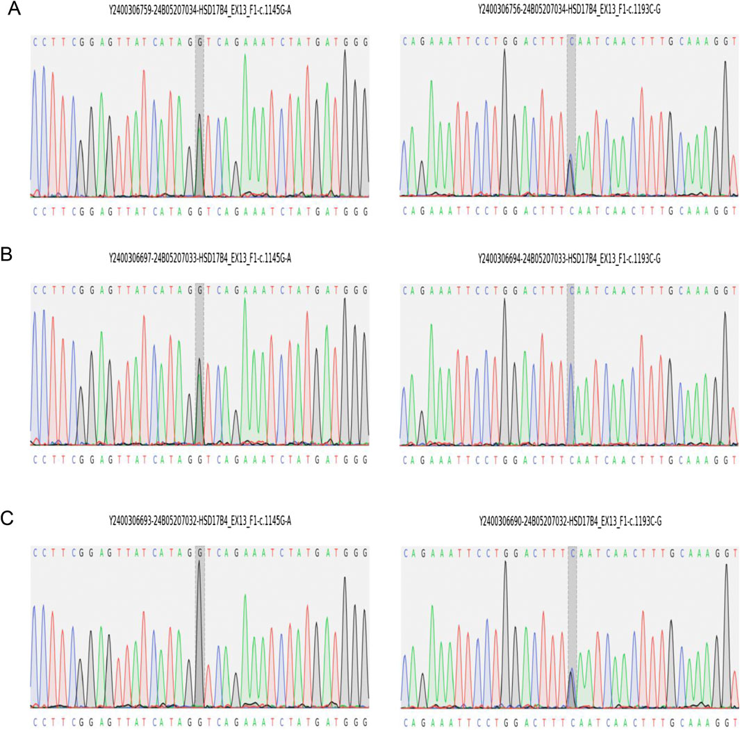 Figure 2. Sanger sequencing validation of HSD17B4 variants identified by whole-genome sequencing in the family. (A) Proband carries both variants of c.1145G>A(p.Gly382Asp) and c.1193C>G(p.Ser398*). (B) The father carries c.1145G>A(p.Gly382Asp). (C) The mother carries c.1193C>G(p.Ser398*).