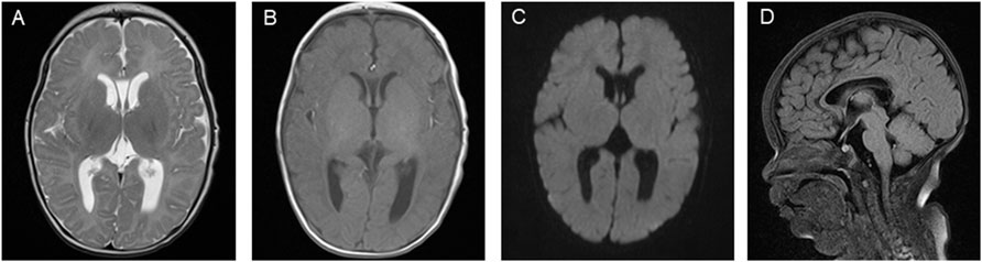 Figure 3. Brain magnetic resonance imaging (MRI) images on the patient’s 51st day of life. (A) T2-weighted imaging (T2WI) showing symmetrical bilateral cerebral hemispheres with normal gray and white matter signal intensities. (B) T1-weighted imaging (T1WI) showing high signal intensity in the posterior limb of the internal capsule and the cavum septum pellucidum. (C) Diffusion-weighted imaging (DWI) showing no obvious abnormal signal. (D) Fluid-attenuated inversion recovery (FLAIR) sequence showing the corpus callosum genu and body with normal morphology.
