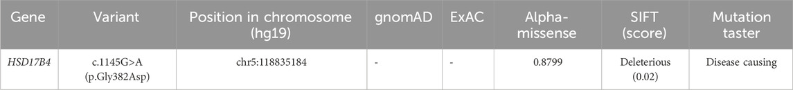 D-BP, encoded by the HSD17B4 gene, plays a critical role in the β-oxidation of fatty acids (Moller et al., 2001). The HSD17B4 gene consists of 24 exons, with exons 1–12 coding for the 3-hydroxyacyl-CoA dehydrogenase domain, exons 12–21 coding for the 2-enoyl-CoA hydratase domain, and exons 21–24 coding for the sterol carrier protein 2-like domain (Jiang et al., 1996). Biallelic pathogenic variants of the HSD17B4 gene affect D-BP function and activity, leading to the accumulation of fatty acids that are detrimental to the development of the central nervous system and are responsible for autosomal recessive D-BPD (Moller et al., 2001). On the basis of the site of functional domain deficiency, D-BPDs are classified into three major types. To date, more than 110 pathogenic variants in the HSD17B4 gene have been recorded in the Human Gene Mutation Database (HGMD) (Ognean et al., 2024), but only a few D-BPD cases have been reported in China. Chen et al. (2021) described a case of neonatal-onset D-BPD caused by the novel HSD17B4 compound heterozygous mutations c.972+1G>T/c.727T>A (p.W243R). In addition, several case reports revealed compound heterozygous mutations c. 686-2A>T/c. 1171G>C, c. 101C>T (p.Ala34Val)/c. 1448_1460del (p.Ala483Aspfs*37), and c112+1G>A/c.394C>T (p.R132W) in the HSD17B4 gene, which are responsible for most D-BPD cases in China (Yang et al., 2021). The limited number of reported D-BPD patients within the Chinese population may be related to the low awareness of this rare disease. The majority of D-BPD patients in China may die before genetic diagnosis. In this report, WGS revealed novel compound heterozygous mutations c.1145G>A(p.Gly382Asp)/c.1193C>G(p.Ser398*) in exon 13 of the HSD17B4 gene in our patient, which were respectively inherited from her mother and father. Neither variant has been reported previously; c.1145G>A (p.Gly382Asp) is defined as a variant of uncertain clinical significance, and c.1193C>G (p.Ser398*) is defined as likely pathogenic, according to ACMG guidelines. Although variant c.1145G>A (p.Gly382Asp) is defined as a variant of uncertain clinical significance according to ACMG guidelines, it was predicted to be pathogenic by multiple bioinformatic algorithms. It is absent from the gnomAD exome and ExAC databases. Furthermore, the variant was predicted to be damaging by SIFT, Alpha-Missense, and Mutation Taster. Nonsense mutations are considered to be a type of harmful variant in genetic disorders. The novel c.1193C>G(p.Ser398*) variant is a nonsense mutation that results in a premature termination codon within the coding region of HSD17B4 at codon 398. The impact of the c.1193C>G(p.Ser398*) on the patient may lead to an aberrant transcript and result in a shortened polypeptide of HSD17B4. The aberrant transcript is likely degraded by NMD, and protein translation stops prematurely at codon 398, resulting in no functional full-length HSD17B4 protein being produced. Thus, our patient is predicted to have type II D-BPD. The clinical manifestations of patients with type II and III D-BPD were reported to be milder than those of patients with type I D-BPD. Although previous studies have shown that some patients with type II and III D-BPD have normal levels of VLCFAs (Landau et al., 2020; Matsukawa et al., 2017; Soorani-Lunsing et al., 2005; Yamamoto et al., 2021), our patient had markedly elevated C26:0 levels and C24:0/C22:0 and C26:0/C22:0 ratios.