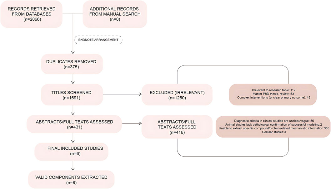 According to the search terms, 2,066 relevant studies were retrieved, from which irrelevant and duplicate studies were excluded; thus, 1,691 articles were screened by reading the literature. By applying the inclusion and exclusion criteria, 15 articles were selected, all of which were in English. All studies were animal experiments, 6 studies (Table 1) were found to have extractable compounds for subsequent analysis, from which 8 important active ingredients were selected, which were: irisin, 5α reductase, kisspeptin, amphetamine-regulated transcript, cocaine-and amphetamine-regulated transcript (CART), nerve growth factor (NGF), neuropeptide Y (NPY), insulin-like growth factor-1 (IGF-1), and interleukin-6 (IL-6) (Figure 2).