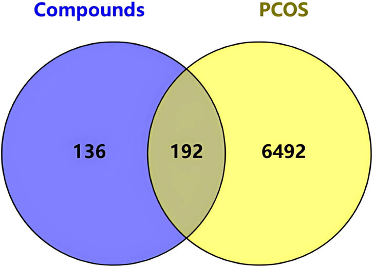 Figure 3. Venn diagram of overlapping targets. Venn diagram showing the intersection between exercise-related compound targets and PCOS-related genes, identifying 192 potential shared targets.