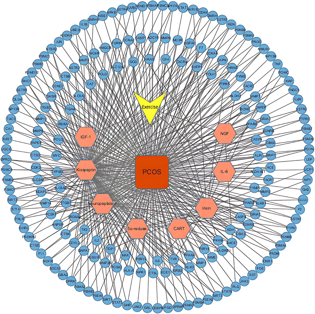 Figure 4. Active ingredient-potential target network. Network visualization depicting the interactions between exercise, the eight active ingredients (orange hexagons), PCOS (red square), and the 192 potential targets (blue circles).
