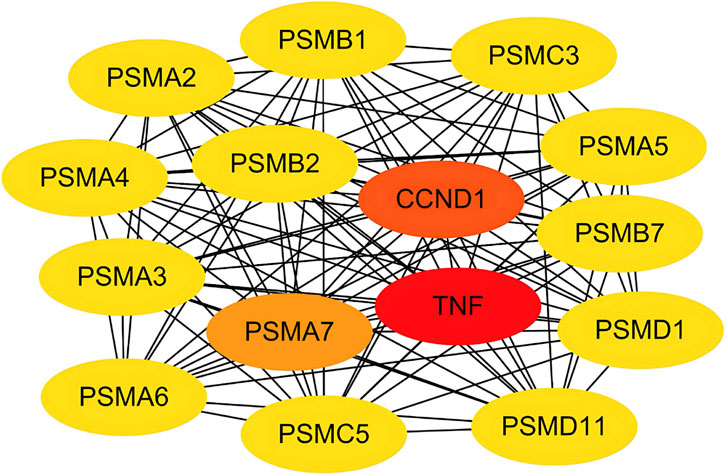 We constructed a PPI network based on the STRING database and visualized 187 nodes using Cytoscape. The Matthews correlation coefficient (MCC) method is an important iterative formula in the CytoHubba algorithm, providing a more accurate measure of node importance by iteratively calculating degree centrality while accounting for the node’s maximal clique. The topological network algorithm uses the CytoHubba plugin to assign values to each gene and to sort and screen hub genes and subnetworks. It was used to calculate the maximum clique centers of the nodes in the protein interaction network, as shown in Figure 5. TNF, CCND1 and PSMA7 showed a high correlation degree. In addition, we used various other algorithms to obtain hub genes (Table 2). Among different algorithms, TNF (appeared 7 times) ranked first, followed by IL6 (6 times), IL1B and JUN (all appeared 5 times).