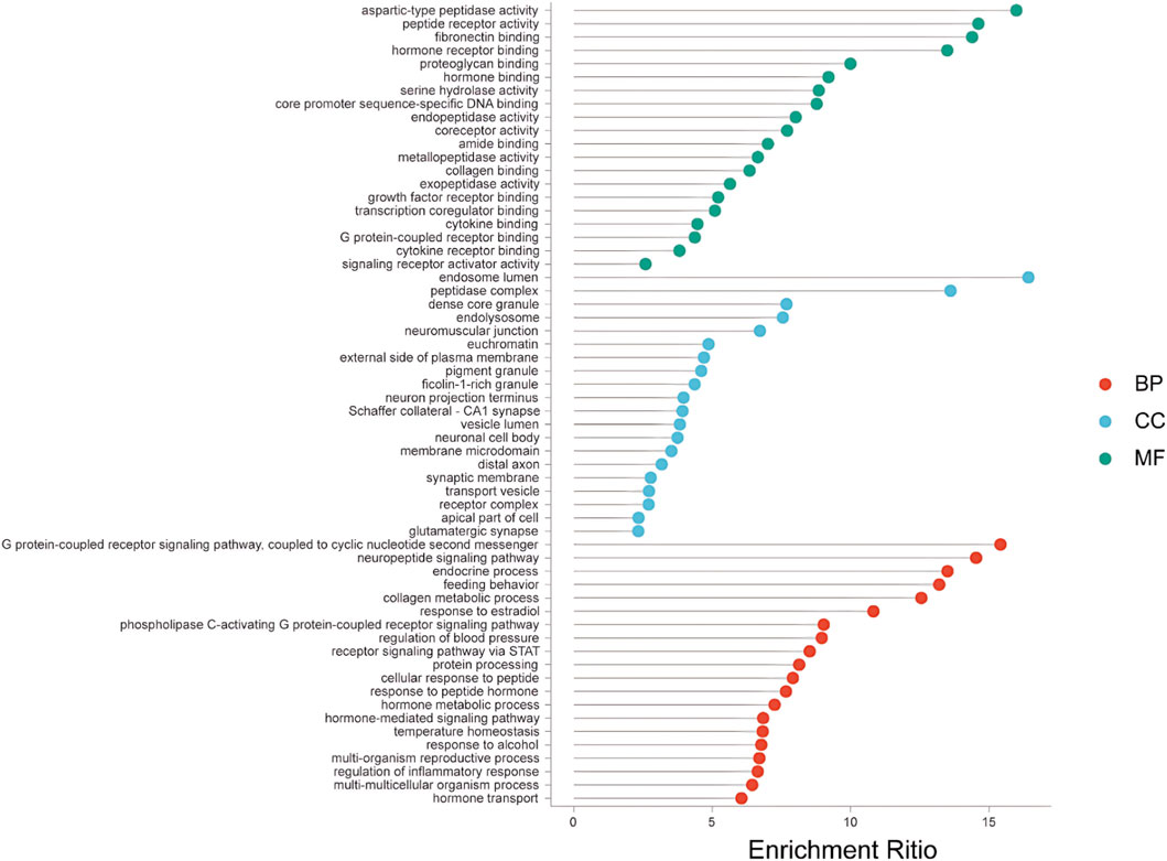 At the BP level, the predicted target was the G protein-coupled receptor signaling pathway, which is mainly involved in the cyclic nucleotide second messenger. Coupled to cyclic nucleotide second messenger, neuropeptide signaling pathway, endocrine processes) and other biological processes have significant significance. At the CC level, the endosome lumen, peptidase complex, and dense core granules occupy a large proportion. The MF is closely associated with aspartic-type peptidase activity, peptide receptor activity, and fibronectin binding.