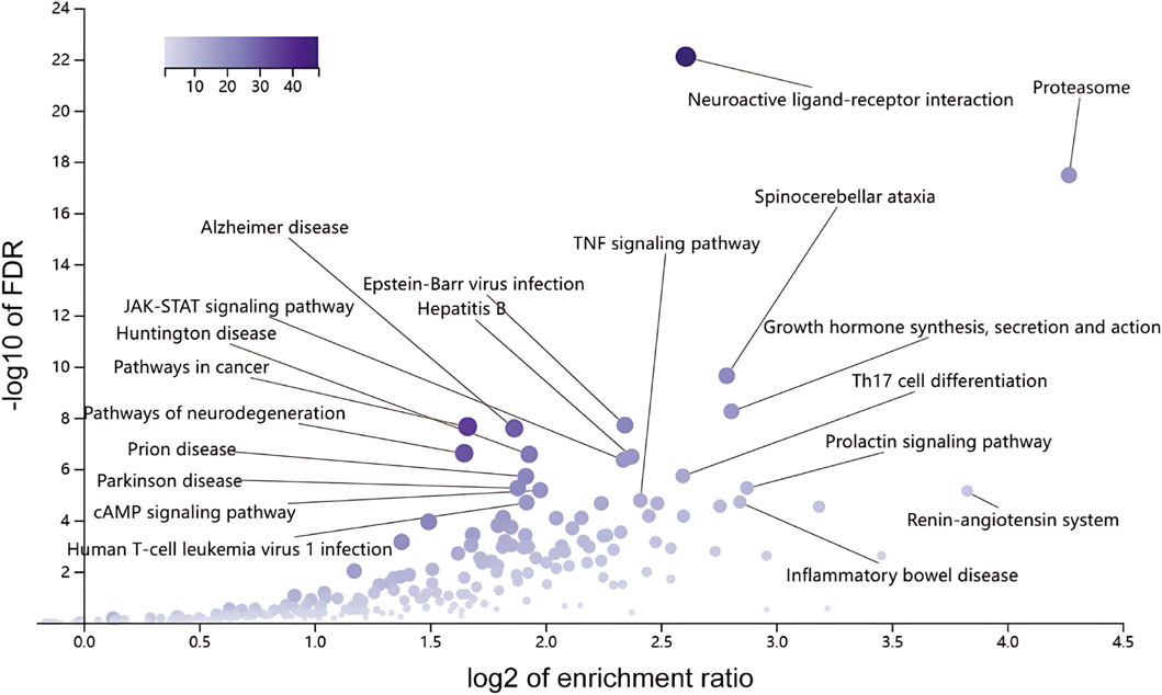 The potential KEGG enrichment results are shown in Figure 7. The KEGG signaling pathway involved the Proteasome, Renin-angiotensin system (RAS), prolactin signaling pathway, inflammatory bowel disease, growth hormone synthesis, secretion, and action (growth hormone synthesis, secretion and action, spinocerebellar ataxia, Th17 cell differentiation, neuroactive ligand-receptor interaction, and TNF signaling pathway.