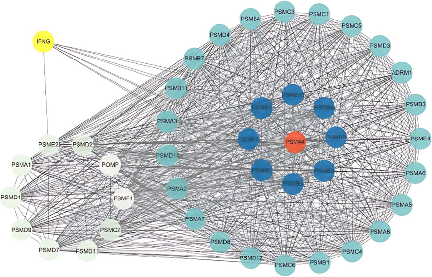 Figure 8 lists the PPI interaction network shown on KEGG of the proteasome protease system, with 43 related proteins in total, among which PSMA4 and its family members may be the key proteins in this pathway, and the secreted protein IFNG is closely related to the protease system.