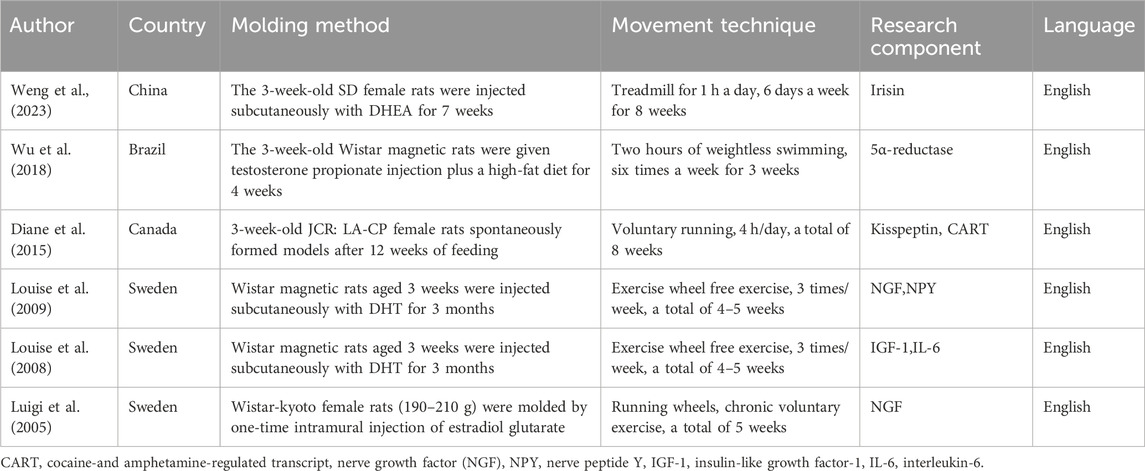The exclusion criteria included the following: (1) clinical studies that did not meet the 2003 Rotterdam Standard (Revised, 2003 consensus on diagnostic, 2004) or 2011 Chinese PCOS diagnostic criteria (Linlin and Zijiang, 2011) (e.g., only the ratio of anti-Muller hormone, menstrual cycle, luteinizing hormone (LH)/follicle-stimulating hormone (FSH) was used to diagnose PCOS); (2) animal experiments that did not include a description that confirmed the success of ovarian pathological section; (3) articles that pertained to complex interventions and reported inconclusive primary effects of exercise; (4) articles that did not include effective information on specific compounds/proteins at the mechanistic level; (5) articles that were literature review; (6) master and doctoral dissertations or conference papers; and (7) duplicate detection or duplicate publication.