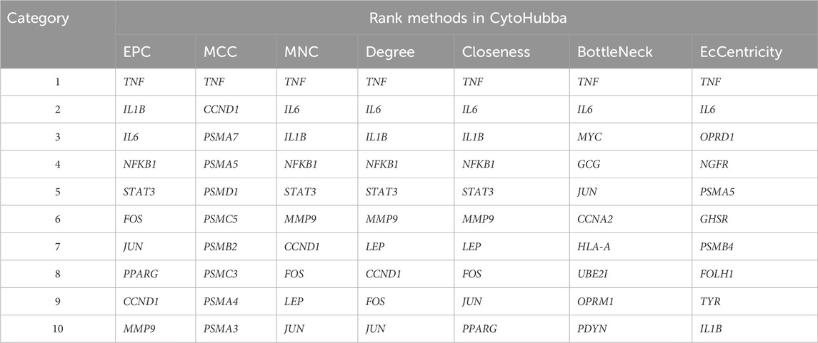Table 2. Top 10 gene sets from different CytoHubba algorithms. Comparison of the highest-ranked genes identified by seven topological analysis algorithms in CytoHubba, demonstrating consistent hub genes like TNF and IL6 across methods.
