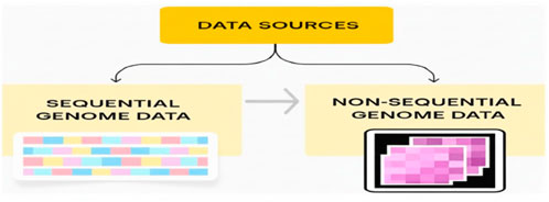 Data used with Gene-LLMs can be categorized into two types: sequential and non-sequential genomics. These data types are presented in Figure 1. Sequential data consist of linear DNA/RNA nucleotide sequences, while non-sequential data are retained in tabular form, such as gene expression matrices.