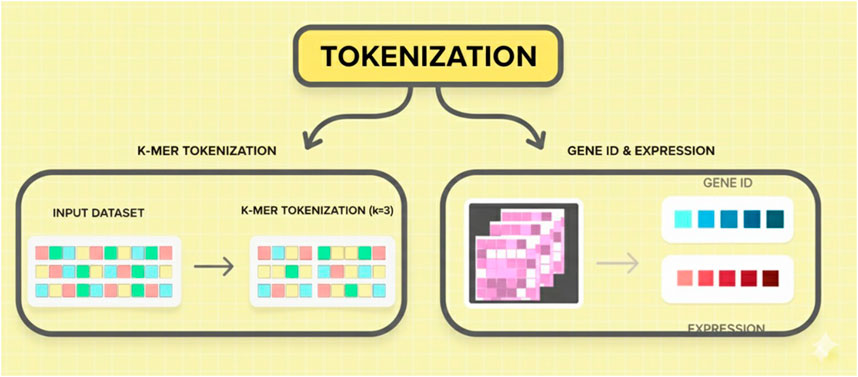 Figure 2 illustrates two methods of tokenization used in genomic language models: k-mer tokenization for nucleotide sequences and expression-based tokenization for gene expression profiles using gene IDs.
