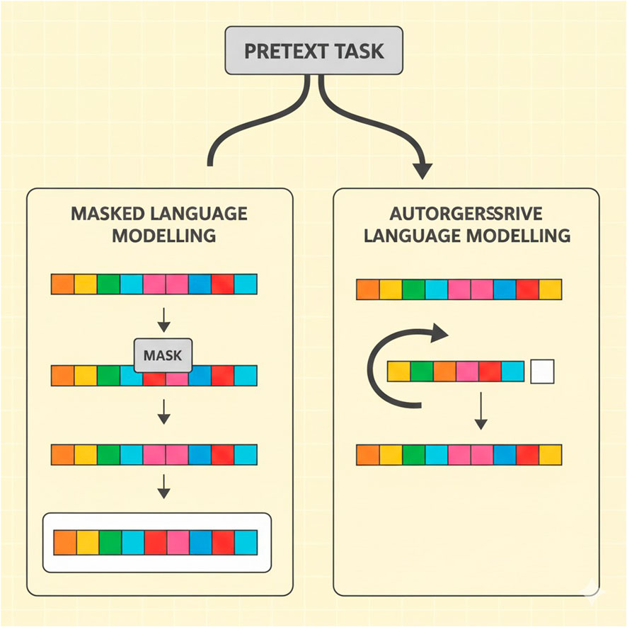 In Figure 3, the principal charts of pretext tasks in the learning of genomic large language models are masked language modeling (MLM) and autoregressive language modeling (ARLM). MLM involves concealing fragments of the sequence and asking the model to recover these parts, whereas ARLM teaches the model to predict the next token in the sequence based on the previous tokens. LLMs use NLP-inspired self-supervised learning strategies to create meaningful genomic representations. In genomic applications, two main pretext tasks are frequently used: autoregressive language modeling (ARLM) and mask language modeling (MLM). By randomly masking specific regions of a DNA sequence, MLM trains a model to predict the missing nucleotides. This technique allows the model to infer contextual dependencies between genetic elements and is similar to the fill-in-the-blank task used in natural language processing. The model learns to reconstruct masked sequences, which helps it better comprehend genomic variations and structures better. ARLM involves predicting the next nucleotide in a sequence based on the preceding nucleotide. Just like the algorithms used to generate text, the application of NLP methods helps the model to capture the relationship between sequences and the joint probability distribution of genes. A model trained with ARLM can effectively identify and link the most promising genetic elements most efficiently, providing a breakthrough for downstream genomic tasks.