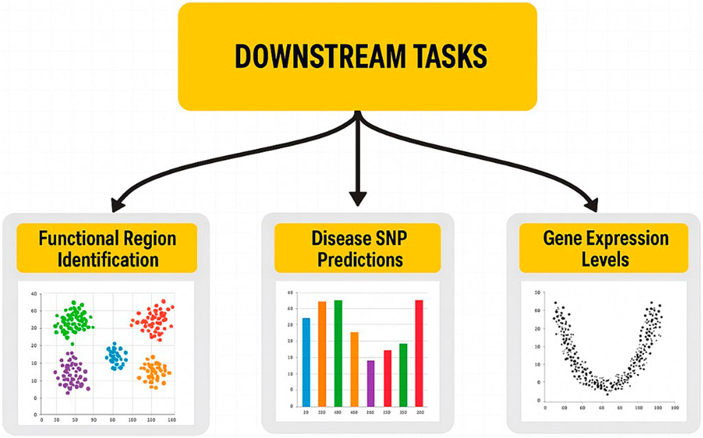 After training, genomic language models (LLMs) can be applied across various life science and medical domains, advancing genomic research and clinical diagnostics (Figure 4). The discovery of functional regions is one of the remarkable uses of genomic LLMs that can determine the key regulatory units, such as enhancers and promoters. To gain insights into transcriptional regulation and genetic interactions, these regulatory regions, which play a crucial role in gene expression control, must be identified. Functional sites in the genome can be predicted in a very accurate manner using learned representations. Forecasting disease single-nucleotide polymorphisms (SNPs) is an essential task for LLMs, whereby these latter are capable of determining the SNP markers of genetic diseases. SNPs are the differences found at single-nucleotide positions in the genome and are used as disease susceptibility biomarkers. Furthermore, LLMs can support disease diagnosis and risk assessment by evaluating the extent to which certain SNPs contribute to the development of pathological conditions through the analysis of genetic variation patterns. Moreover, genomic LLMs can also be used to predict the gene expression, which is essential for understanding the behavior of cells under different biological states. Thus, in addition to having the ability to foresee gene activity or inactivity in different cell types, the LLMs can, through the combination of the RNA profiles with DNA sequence information, accurately determine the specific level at which the genes are functioning. This feature is very important in areas where an accurate model of gene expression dynamics is required, such as in drug discovery, regenerative medicine, and cancer genomics. The development of self-supervised learning techniques, tokenization, and model interpretability is crucial to improving genomic LLMs’ ability to analyze complex genomic data as the field continues to expand. These models could be harnessed to transform the way precision medicine and genomics research are being carried out as they establish the link between unprocessed genomic sequences and meaningful biological insights.