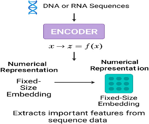 Raw sequence data, such as DNA or RNA information, usually require a numerical representation prepared by the encoder. The main issue to be addressed in this process is how to preserve the biologically relevant information in the dataset. The embedding (often referred to as such) is a fixed-size representation that is context-aware and carries the numerical information. It describes the most important patterns in the sequential input and also supports tasks such as variant prediction, classification, and functional annotation. It is important to note that the encoder (referred to as the deep learning model input) of any dynamic or static data source may also benefit from the kernel network’s help in transforming the source data. This process is known as feature extraction.