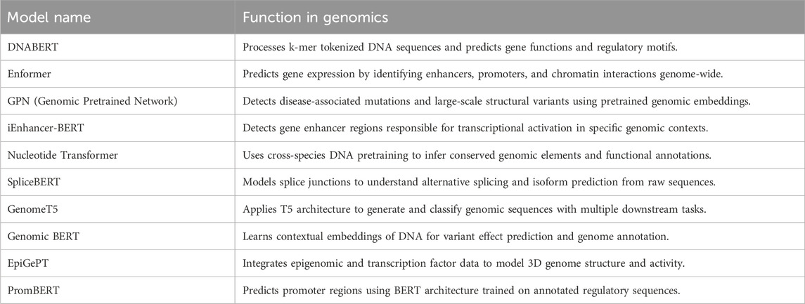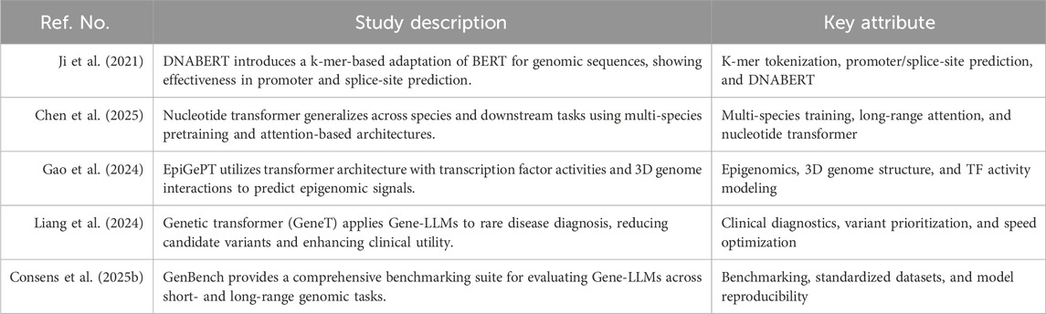 Table 9. Core genomic tasks addressed by Gene-LLMs with their subtasks, objectives, and representative models.