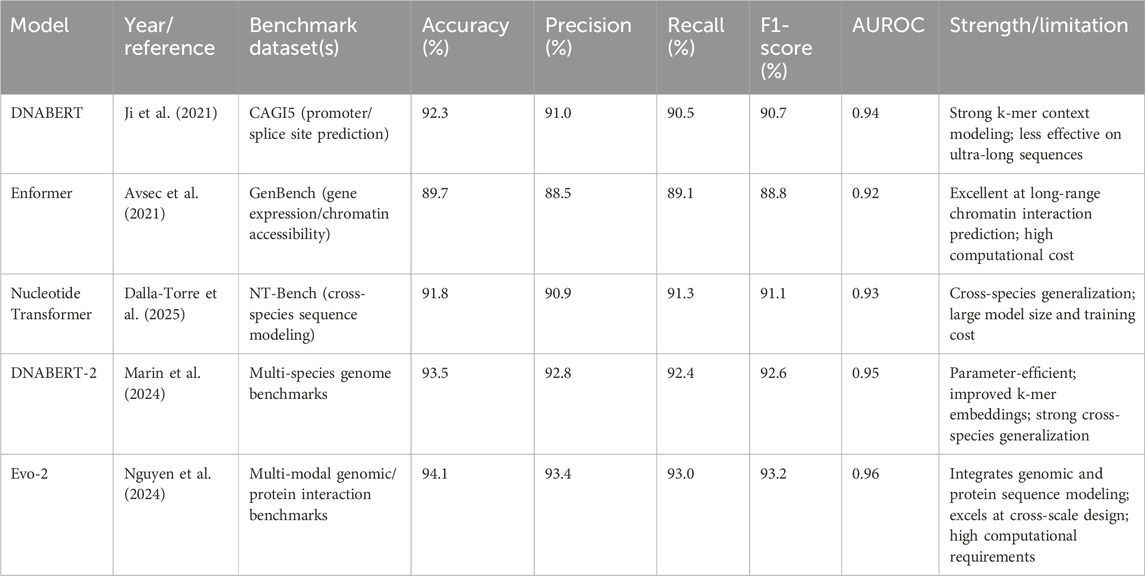 Table 2 summarizes the comparative performance of selected Gene-LLMs on representative benchmarks, along with their strengths and limitations.