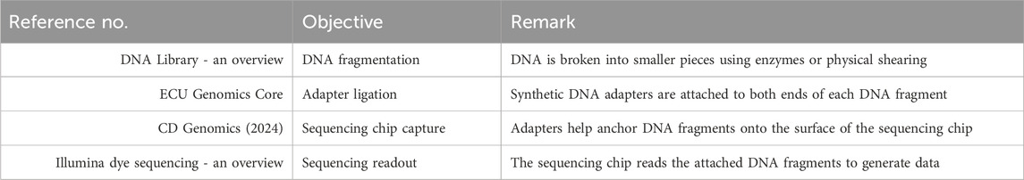 DNA is often extracted from whole blood samples that are kept stable with citrate or EDTA to prevent decomposition. Other examples are surgical specimens or biopsy tissue. Since the sensitivity of the copy number variation (CNV) test is greatly improved, high-molecular-weight DNA is suggested. Through the newer protocols of WGS, DNA amplification has been excluded, thus leading to equal sequence depth across the whole genome, and the success of the experiment has been accompanied by low biases in the results. Library preparation is carried out after DNA extraction to prepare the DNA for sequencing. To improve sequence alignment, DNA is broken down into much smaller fragments, which are generally approximately a few hundred base pairs in length. Subsequently, the fragmented DNA molecules are attached to the screen with adapters to enable them to be captured by the sequencing chip. To clarify the sequence of DNA fragments, multiple barcoded samples are essential for multiplex sequencing. This method not only protects the data from being tampered with but also enables the parallel sequencing of several cases. The generation of DNA fragments for sequencing starts with specific steps, such as fragmentation, adapter ligation, and sequence chip attachment, as shown in Table 4 (DNA Library - an overview; ECU Genomics Core; CD Genomics, 2024; Illumina dye sequencing - an overview; Ji et al., 2021; Chen et al., 2025; Gao and Zhou, 2024; Consens et al., 2025b; Liu et al., 2025 collectively demonstrate the power of transformer-based AI models in advancing genomic and single-cell biomarker analysis).