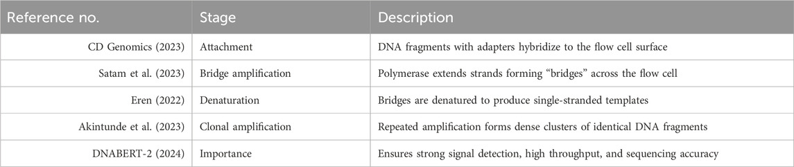 The cluster generation phase is crucial for amplifying DNA fragments prior to sequencing. The prepared DNA libraries are loaded onto a flow cell, a specialized sequencing chip, and distributed across its surface. Each DNA fragment undergoes clonal amplification via polymerase-mediated reactions, resulting in clusters of identical DNA molecules. This amplification process ensures a sufficient signal-to-noise ratio during sequencing, improving the accuracy of base calling. The next stage, sequencing, involves determining the nucleotide sequence of each DNA fragment. WGS primarily utilizes short-read sequencing technology, generating sequence reads of approximately 100–300 base pairs. The sequencing process follows a cycle-by-cycle approach, in which a DNA polymerase enzyme incorporates fluorescently labeled nucleotides one at a time. As each nucleotide is added, a high-resolution confocal fluorescence laser detects the emitted signals, which correspond to the specific base incorporated. This fluorescence-based detection allows for accurate sequence determination, ensuring high-resolution genomic analysis. The key steps involved in the cluster generation phase of next-generation sequencing (NGS) are outlined in Table 5 (Satam, 2023; CD Genomics, 2023; Eren et al., 2022; Akintunde, 2023; DNABERT-2, 2024), beginning with DNA fragment attachment and progressing through amplification stages critical for signal detection and sequencing accuracy.