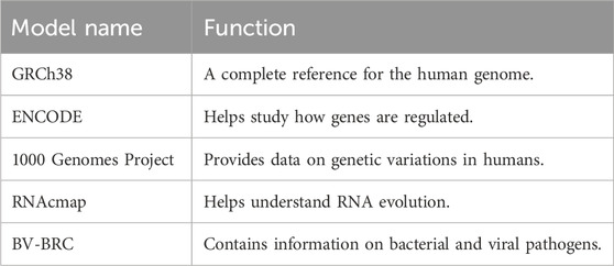 As shown in Table 7, several genomic reference models such as GRCh38 and ENCODE provide foundational data for genome analysis.