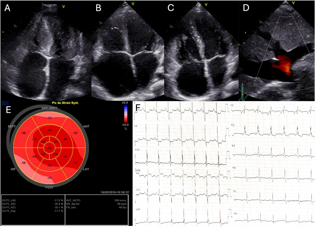 Figure 1. Echocardiography and electrocardiogram. A, B, C Four-chamber echocardiogram at end-diastole of patient 1 (A), patient 2 (B) and patient 3 (C); (D) Subcostal echocardiographic view of patient 2; (E) LV strain longitudinal of patient 3; (F) Electrocardiogram of patient 1.