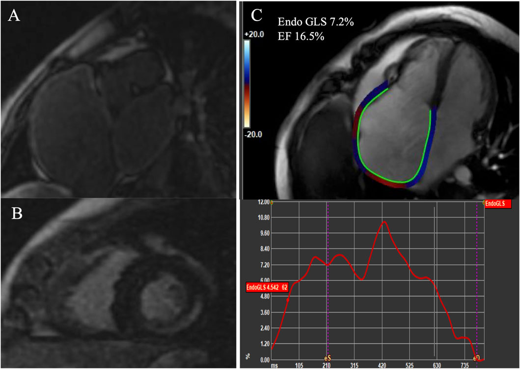 Figure 2. CMR data (A) Bi atrial LGE; (B) Left ventricle LGE; (C) RA strain of patient 2. LGE Late gadolinium enhancement, RA right atrial.