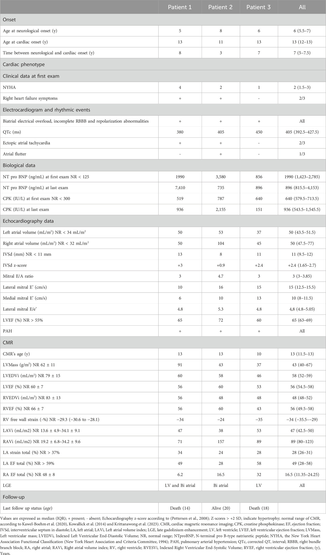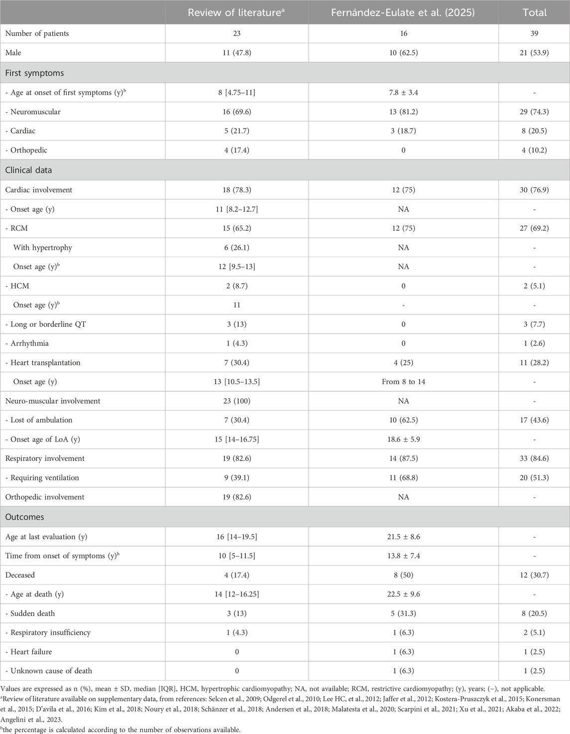 Cardiac involvement affected 76.9% of these patients. Early-onset cardiomyopathy was the most frequently reported feature, exhibiting a restrictive pattern in 69.2% of cases and associated to ventricular hypertrophy in six cases. Two patients had mild LV wall thinckening, raising the possibility of restrictive phenotype seen at an early stage. Nine patients had no cardiac anomalies despite similar neurological, respiratory, and orthopedic symptoms (Andersen et al., 2018; Kim et al., 2018; Noury et al., 2018; Malatesta et al., 2020; Akaba et al., 2022; Fernández-Eulate et al., 2025), suggesting a variable expressivity of the cardiac phenotype. A prolonged or borderline QT interval was observed in three patients overall (Lee et al., 2012; Kostera-Pruszczyk et al., 2015; Xu et al., 2021). Conduction disturbances and arrhythmias were reported in one case (D’Avila et al., 2016). This incidence might have been underestimated in prior studies which focused on the description of neuromuscular presentation. We observed bi-atrial fibrosis on CMR in both patients with supraventricular arrhythmias. Therefore, our case series highlights that rhythm monitoring is essential in these patients for an early diagnosis of atrial arrhythmias and the prevention of potential thromboembolic complications.