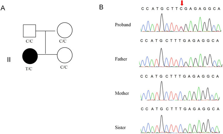 Figure 1. Genetic information of proband’s family. (A) Pedigree of the proband’s family. (B) Consequence of Sanger sequencing.