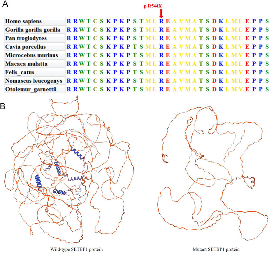 Figure 2. Predicting the impact of c.1630C>T variation on SETBP1 protein’s structure. (A) Conservation analysis among different species. (B) The protein structure of SETBP1 is depicted with and without the mutant variations.