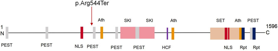 Multiple sequence alignment of the SETBP1 gene across nine species revealed that the amino acid affected by the c.1630C>T variant is highly conserved (Figure 2A). The SETBP1 protein sequence contains three AT-hook domains (Ath), a SKI homologous region, a HCF1-binding motif (HCF), a SET-binding domain (SET), three bipartite NLS motifs, six PEST sequences and two repeat domain (Rpt). Using Swiss-Model for protein tertiary structure prediction (Figure 2B), this variant leads to a nonsense mutation at nucleotide 1,630, where cytosine (C) is replaced by thymine (T), resulting in premature translation termination. Consequently, the protein structure beyond amino acid 544 is entirely lost, with only the two PEST and NLS motifs remaining to confer partial function, and all other domains abolished (Figure 3). This extensive damage is predicted to severely compromise the overall function of the SETBP1 protein.