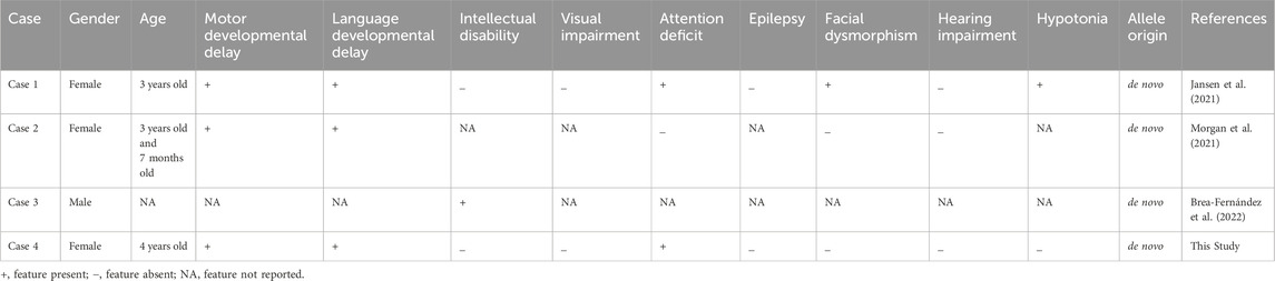 MRD29 exhibits significant clinical heterogeneity, and no clear genotype-phenotype correlation has been established to date. To date, a total of four cases (including the present study) carrying the SETBP1 gene c.1630C>T mutation have been documented, all of which were confirmed as de novo variants (Table 1). The mutation exhibits a broad phenotypic spectrum with varying severity. One case presented solely with intellectual disability (Brea-Fernández et al., 2022), another exhibited intellectual disability accompanied by motor developmental delay (Morgan et al., 2021), while a more severe case manifested a combination of intellectual disability, motor developmental delay, attention deficit, facial dysmorphism, and hypotonia (Jansen et al., 2021). The SETBP1 hotspot variant c.1873C>T (p.Arg625Ter), although reported in 6 confirmed cases, showed significant phenotypic variation in affected individuals (Jansen et al., 2021; Morgan et al., 2021; Coe et al., 2014). In a study by Wang et al. involving a non-consanguineous family, four members carrying the identical c.942_943insGT (p.Asp316TrpfsTer28) variant exhibited distinct clinical manifestations: while the affected mother presented with auditory abnormalities and white matter lesions, her affected daughter showed none of these features (Wang H. et al., 2023). This observation strongly suggests that identical variants within the same pedigree can produce differential phenotypic expression. Consequently, comprehensive screening of SETBP1 mutation patterns through WES significantly enhances diagnostic accuracy for MRD29, thereby facilitating timely clinical interventions.