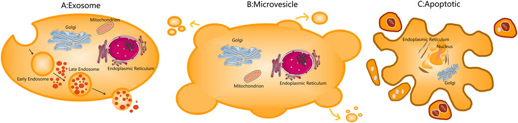 Figure 1. Schematic of extracellular vesicles. (A) Exosomes are extracellular vesicles of endocytic origin derived from different cells. (B) Microvesicles are derived from the plasma membranes of cells. (C) Apoptotic bodies are vesicles that separate from post-apoptotic cells.
