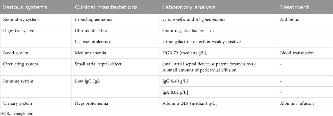 A 4-month-old male infant with no family history of immunodeficiency was born via full-term cesarean section to healthy, non-consanguineous parents (G1P1). Birth history indicated nuchal cord and meconium-stained amniotic fluid, with a history of neonatal transfusion. Postnatal feeding involved a combination of breast milk and formula. At 3 months of age, the infant developed recurrent diarrhea (7–8 episodes daily), characterized by yellow-green loose stools with mucus. Symptomatic treatment reduced stool frequency but did not improve stool consistency. By 4 months of age, he exhibited recurrent fever and persistent diarrhea. Laboratory tests revealed anemia with a hemoglobin level of 85 g/L (reference range, 100–140 g/L). During hospitalization, anti-infective and supportive therapies were ineffective. After referral, due to the complexity of the condition, the family ultimately opted to discontinue treatment. Key clinical features throughout the disease course included recurrent fever, diarrhea, cough, progressive anemia, hepatosplenomegaly and generalized edema (Table 1).