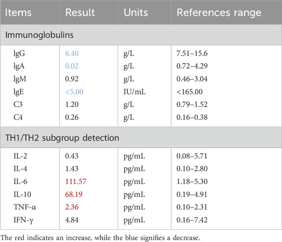 Continuous monitoring of routine blood parameters after admission revealed the following: although the white blood cell count remained within normal range, lymphocyte counts were markedly reduced (0.17–1.15 × 109/L, reference 0.8–4.0 × 109/L) (Figures 1A,B). Hemoglobin levels remained persistently below normal despite multiple erythrocyte transfusions (56–94 g/L, reference 100–140 g/L) (Figure 1C). A markedly elevated high-sensitivity C-reactive protein (hs-CRP) level suggested an ongoing infectious process. The observed decline in hs-CRP at 4 months and 27 days of age was attributed to a 3-day course of glucocorticoid therapy. Notably, the hs-CRP subsequently increased following discontinuation of corticosteroid treatment (Figure 1D).