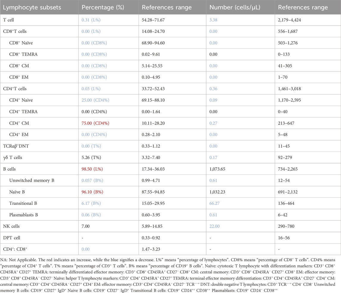 Peripheral blood mononuclear cells (PBMCs) of the patient were isolated and counted. The following fluorescently labeled antibodies were used for surface staining of T and B cells: anti-TCRαβ-PE (306708; BioLegend), anti-TCRγδ-Brilliant Violet 421 (331218; BioLegend), anti-CD3-PerCP (300326; BioLegend), anti-CD4-FITC (300506; BioLegend), anti-CD8a-Brilliant Violet 510 (301048; BioLegend), anti-CD27-APC (356410; BioLegend), anti-CD45RA-PE-Cy7 (304126; BioLegend), anti-CD19-APC (302212; BioLegend), anti-CD27-PB (302822; BioLegend), anti-IgD-AF488 (348216; BioLegend), anti-CD38-PerCP (303520; BioLegend), and anti-CD24-PE (311106; BioLegend). Stained cells were analyzed using a FACS Canto Plus flow cytometry (BD, United States) and data were processed using FlowJo software.