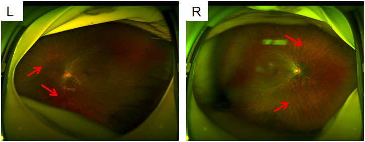 Figure 1. Fundus photographs L: left eye; R: right eye; both eyes show a leopard fundus. It was more obvious in the right eye (where the red arrow is pointed). Spot-like changes resembling leopards appear on the retina of the fundus.