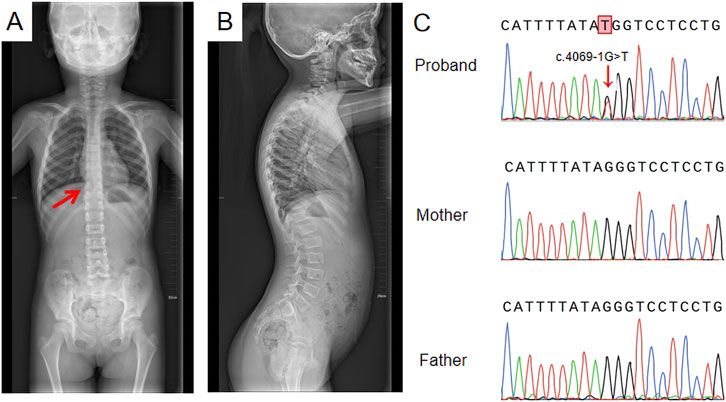 Figure 2. Spinal X-ray and Sanger sequencing results (A) Full-length anteroposterior radiograph of the spine; the red arrow indicates mild scoliosis; (B) Full-length lateral radiograph of the spine showing no significant change; (C) Sanger sequencing results: a de novo heterozygous splice site variant, c.4069-1G>T, was identified.