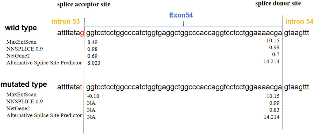 Figure 3. Predictions of the scores of acceptor and donor splice sites of COL11A1 exon 54. The blue closed arrow indicates exon 54. The splice sites are located on either side of the dashed line. The scores calculated via four splice site prediction programs are displayed next to each splice site. MaxEntScan and Alternative splice site predictor scores: higher positive values indicate stronger splice sites. NNSPLICE and NetGene2 scores range from 0.0 to 1.0, with higher scores indicating higher confidence in a true splice site. The scores significantly decreased, and the mutated type showed a loss of the acceptor splice site, indicating that the variant weakened the acceptor splice site. NA: no splicing sites.