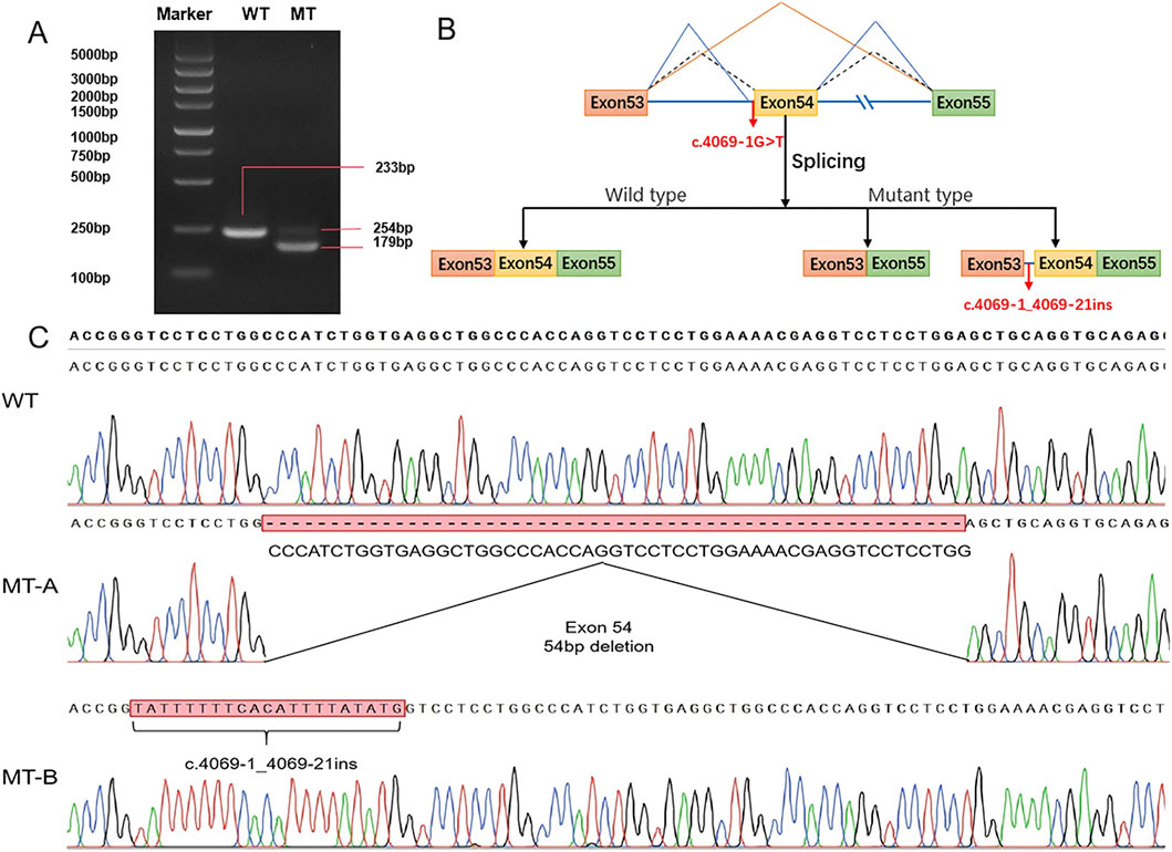 Figure 4. Minigene vector constructs for the in vitro splicing assay (A) Electrophoretogram of RT‒PCR products: Lane 1: marker; Lane 2: wild type (WT) plasmid: 233 bp product; Lane 3: mutant type (MT) plasmid MT-A product (179 bp), MT-B product (254 bp). (B) Schematic representation of the splicing events associated with this COL11A1 variant. (C) Sanger sequencing of RT‒PCR products: variant c.4069-1G>T resulted in a 54 bp deletion caused by exon 54 skipping and retention of 21 bp in intron 53.