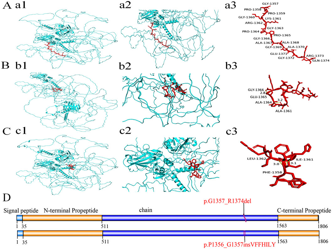 Figure 5. The domain and three-dimensional structures of the wild type and variant COL11A1 proteins. (A-C) Protein structure analysis including diagrams of three proteins, with each displaying two views (one zoomed) and annotated red amino acid sequences. The 3D structure of COL11A1 wild type (a1) and two variant proteins (b1, c1). Local magnification of the deleted and inserted areas in COL11A1 proteins (a2: WT, b2: p.G1357_R1374del, c2: p.P1356_G1357insVFFHILY). In the 18-amino acid region of the wild type (a3), no hydrogen bond interaction was found. But both variant proteins (b3, c3) have generated new hydrogen bonds in the mutant regions (b3: Gly1366 and Glu1365, Ala1364 and Ala1361; c3: Leu1362 and Phe1358, Ile1361 and Phe1358). These changes may lead to the instability of local peptide chainstructure or cause abnormal folding of the helix. (D) Schematic representation of COL11A1 protein domains. The red font indicates deletion of 18 amino acids and insertion of seven amino acids. In accordance with HGVS recommendations, amino acid changes are described using single-letter abbreviations (G: Gly; R: Arg; P: Pro; V: Val; F: Phe; H: His; I: Ile; L: Leu; Y: Tyr).