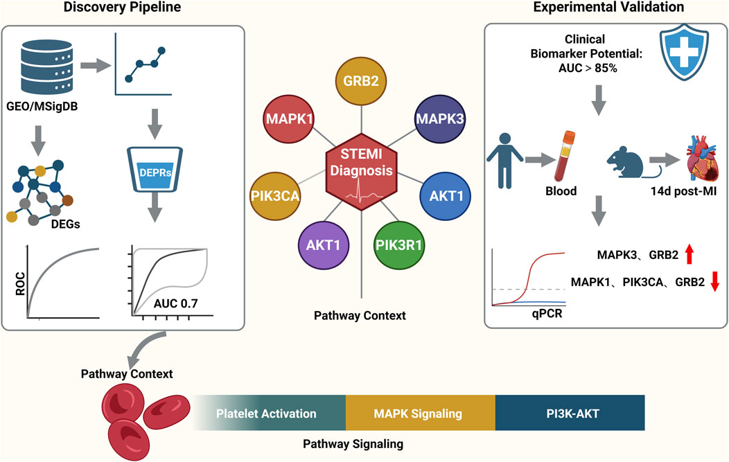 Flowchart illustrating the discovery pipeline and experimental validation for STEMI diagnosis. On the left, bioinformatics data processing leads to DEPRs and pathway contexts, emphasizing platelet activation and signals like MAPK1. In the center, STEMI diagnosis is linked with six key proteins, including MAPK and PIK3. The right side shows experimental validation through blood testing, highlighting qPCR results with MAPK3 and GRB2 levels increasing 14 days post-MI. Clinical biomarker potential exceeds 85% AUC.