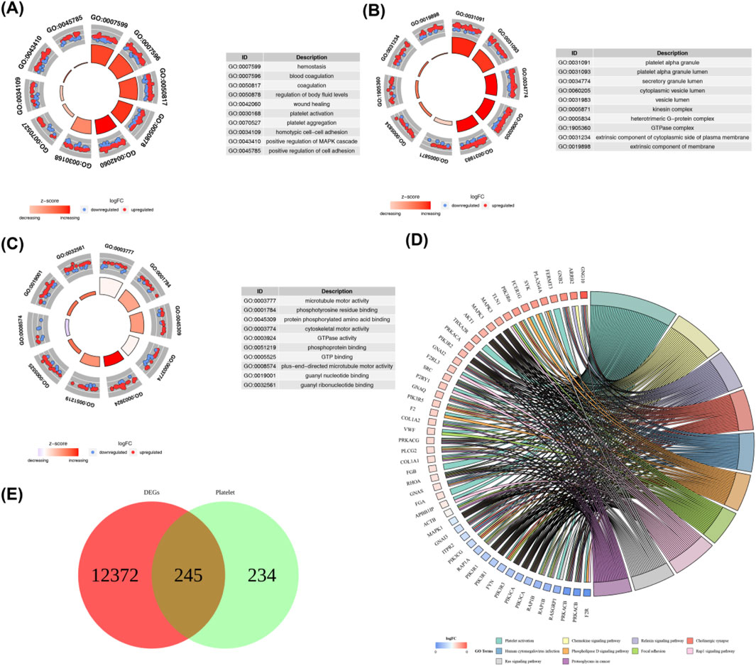 Diagram showing various bioinformatics analyses. (A) Circular bar plot with Gene Ontology (GO) terms related to hemostasis and cell adhesion with descriptions. (B) Similar plot highlighting components like platelet granules. (C) Another plot showing terms related to motor activity with descriptions. (D) Chord diagram displaying interactions among bio pathways. (E) Venn diagram comparing DEGs and PlanNet with 12372, 245, and 234 items, respectively. Color keys indicate z-score and log fold change.