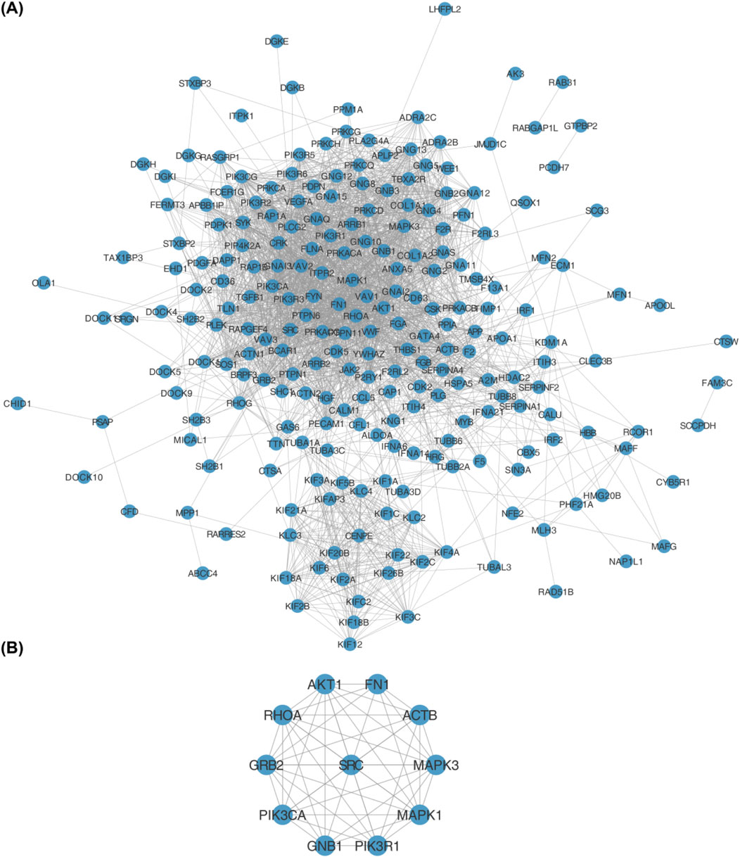 Figure 3. (A) Protein-protein interaction (PPI) network of 245 differentially expressed platelet-related genes (DEPRGs) constructed using the STRING database. Nodes represent genes, and edges represent functional interactions. (B) Hub genes identified from the PPI network using the CytoHubba plugin in Cytoscape. The 11 hub genes are: AKT1, FN1, ACTB, MAPK3, MAPK1, PIK3R1, GNB1, PIK3CA, GRB2, RHOA, and SRC.