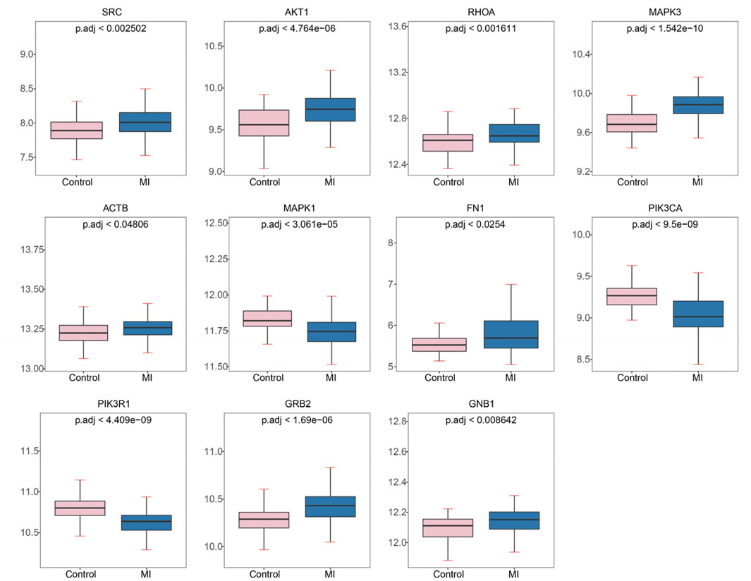 Figure 4. Expression levels of hub genes in myocardial infarction (MI) and control samples from GSE59867. Significantly upregulated genes in MI: SRC, AKT1, RHOA, MAPK3, ACTB, FN1, GNB1, GRB2. Significantly downregulated genes in MI: MAPK1, PIK3CA, PIK3R1. Plots show mean expression values with p.adj (adjusted p-value) for group comparisons.