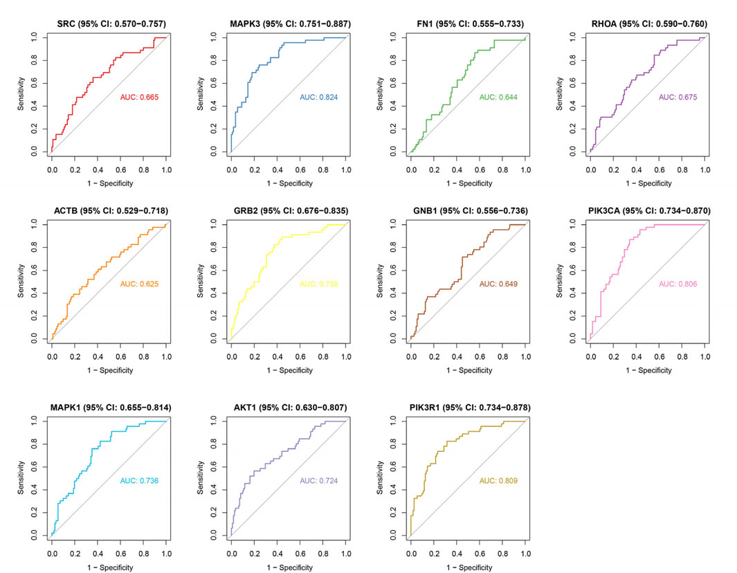Nine ROC curve plots displaying sensitivity versus 1-specificity for different proteins or genes: SRC, MAPK3, FN1, RHOA, ACTB, GRB2, GNB1, PIK3CA, MAPK1, AKT1, and PIK3R1. Each plot includes a colored curve, a diagonal reference line, and an Area Under the Curve (AUC) value. Confidence intervals are provided for each protein or gene. Overall, AUC values range from 0.625 to 0.809.