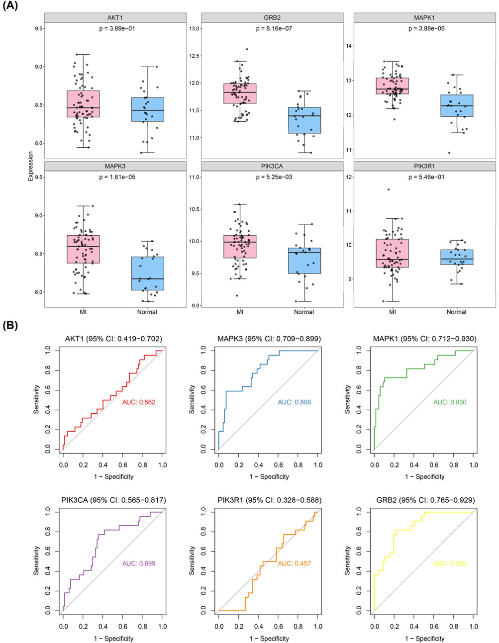 (A) Box plots showing expression levels of genes AKT1, GRB2, MAPK1, MAPK3, PIK3CA, and PIK3R1 in MI and Normal groups. Significant differences are noted in GRB2, MAPK1, MAPK3, and PIK3CA. (B) ROC curves for AKT1, MAPK3, MAPK1, PIK3CA, PIK3R1, and GRB2 displaying sensitivity and specificity with AUC values. MAPK1, MAPK3, and GRB2 show higher AUC values, indicating better predictive performance.