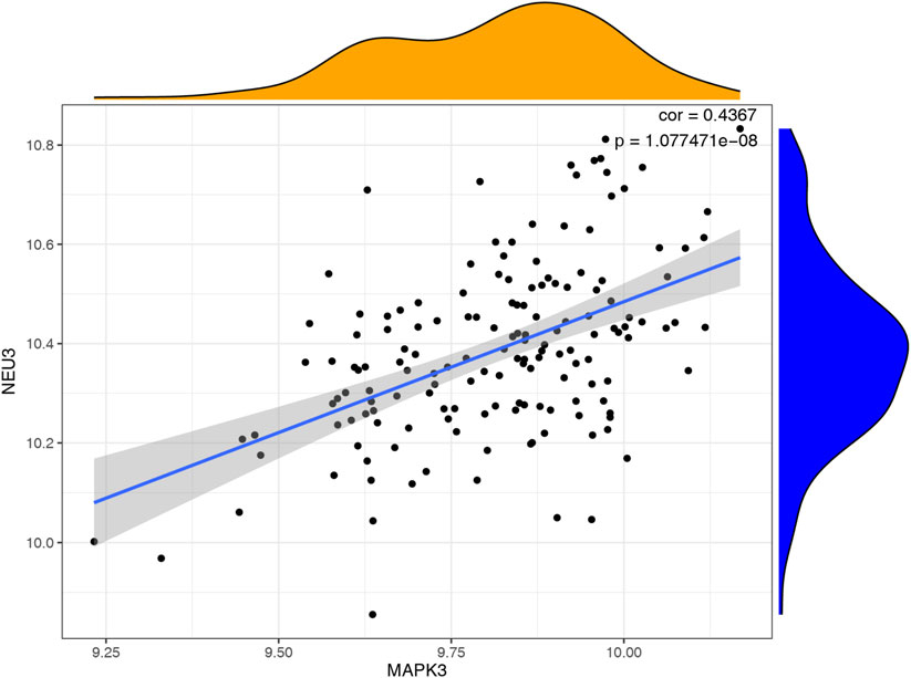 Scatter plot showing the relationship between NEU3 and MAPK3 with a positive correlation of 0.4367 and a p-value of 1.077471e-08. A blue regression line with a grey confidence interval is overlaid. Density plots are displayed on the top and right axes, with orange for NEU3 and blue for MAPK3.