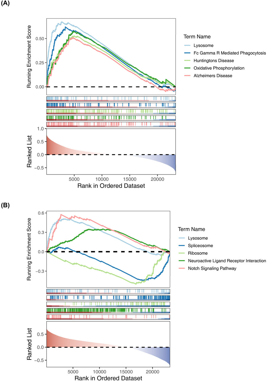 Graphs labeled A and B show enrichment scores against the rank in an ordered dataset. Both graphs include multiple colored lines representing different biological terms, such as Lyosome and Huntington's Disease in A, and Spliceosome and Neuroactive Ligand Receptor Interaction in B. Each graph is divided into sections detailing running enrichment scores and ranked lists, with horizontal dashed lines indicating baseline levels.